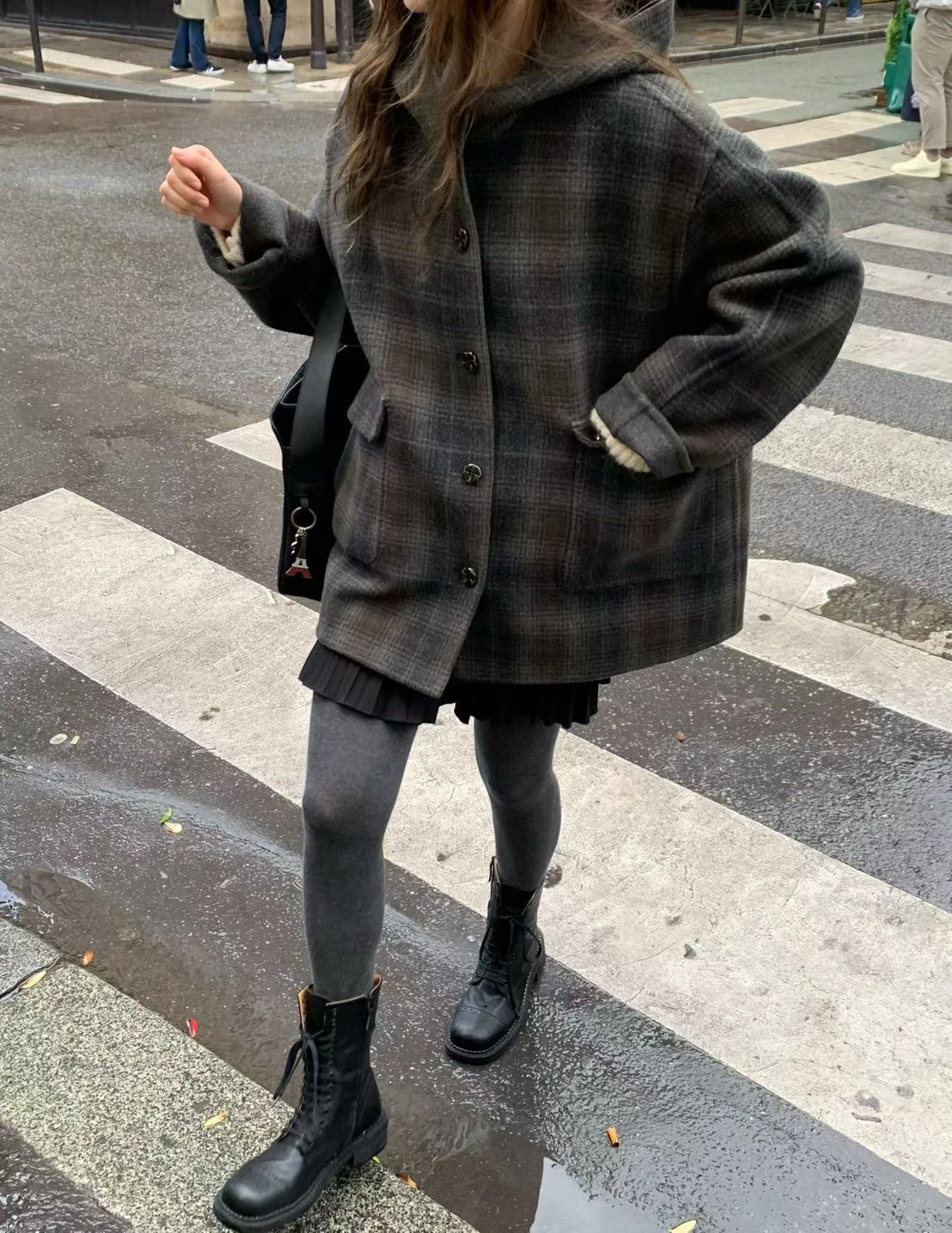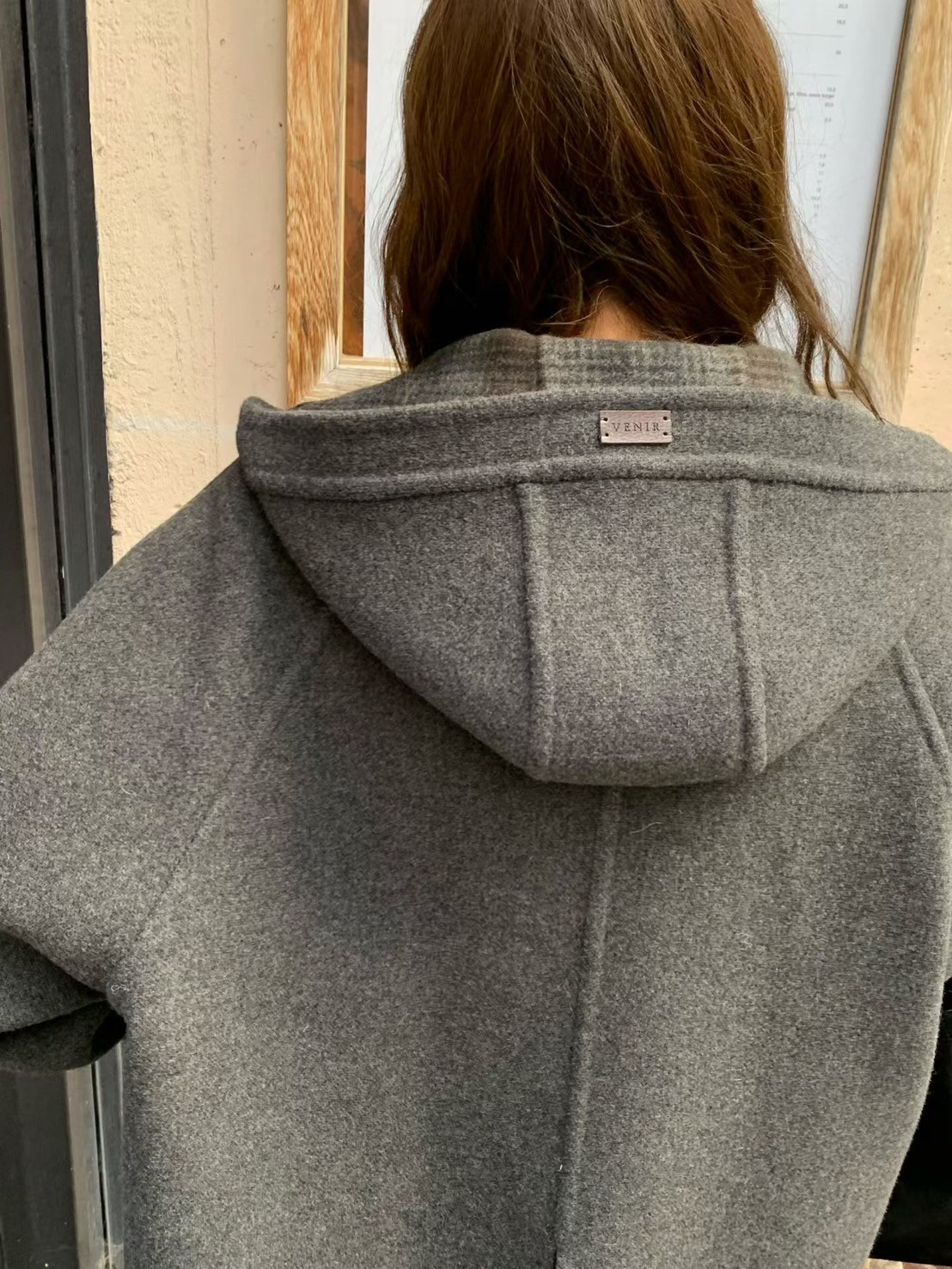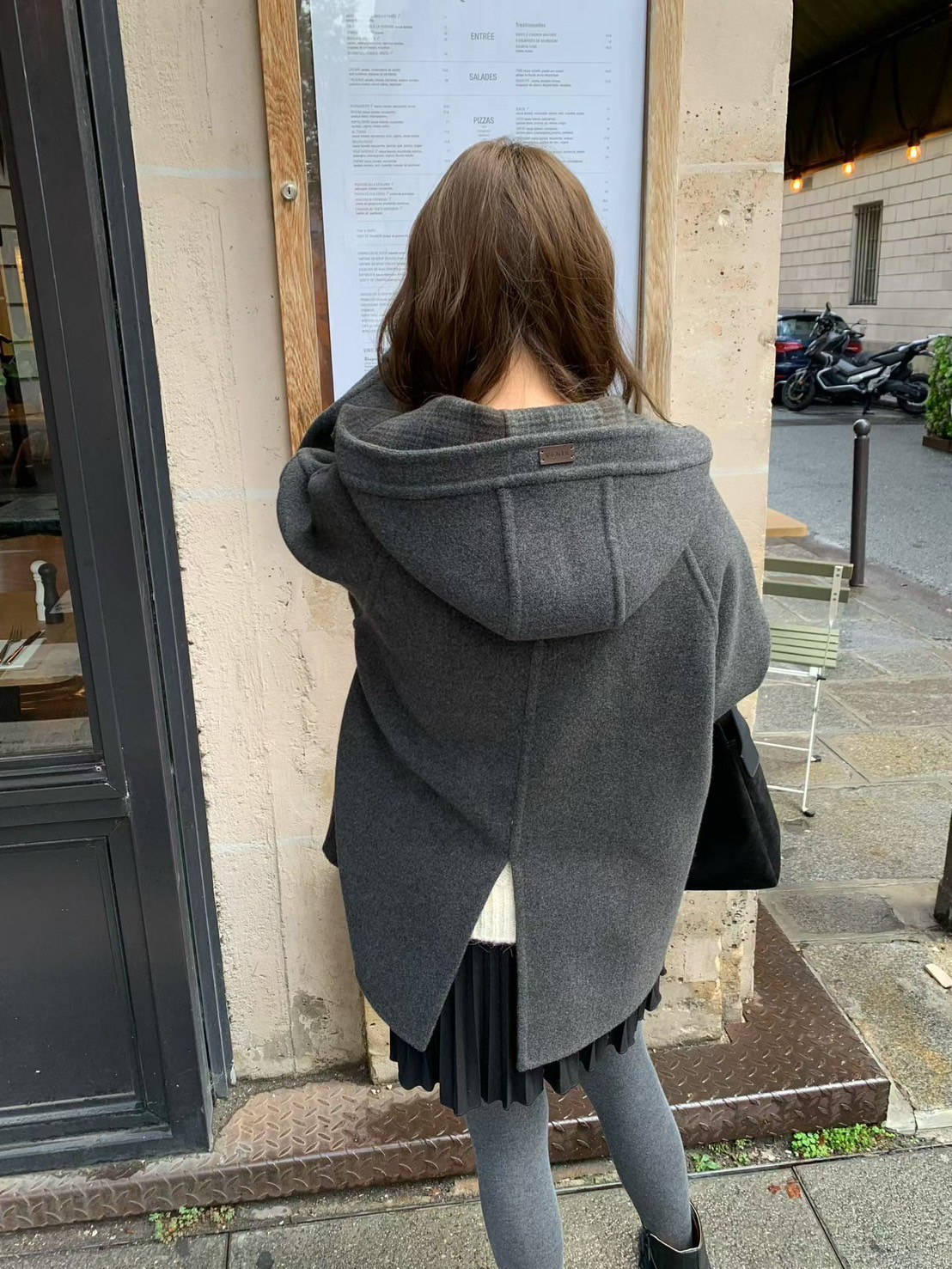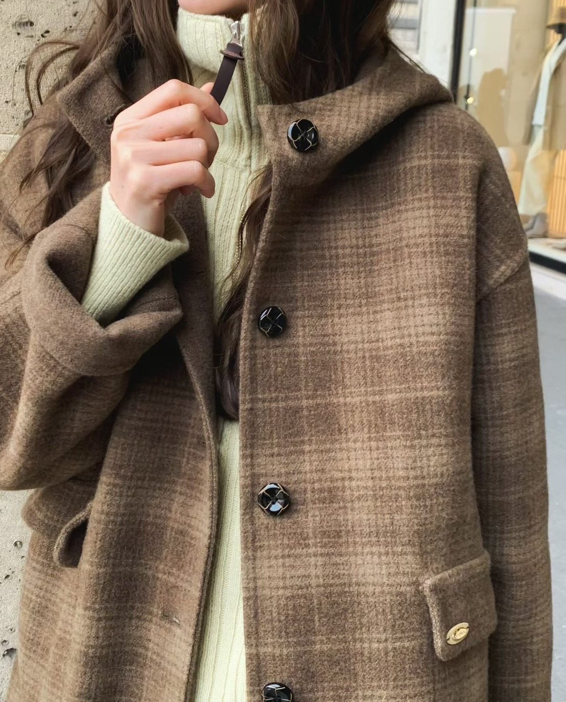 高級法式格紋兩面穿羊毛連帽手工大衣