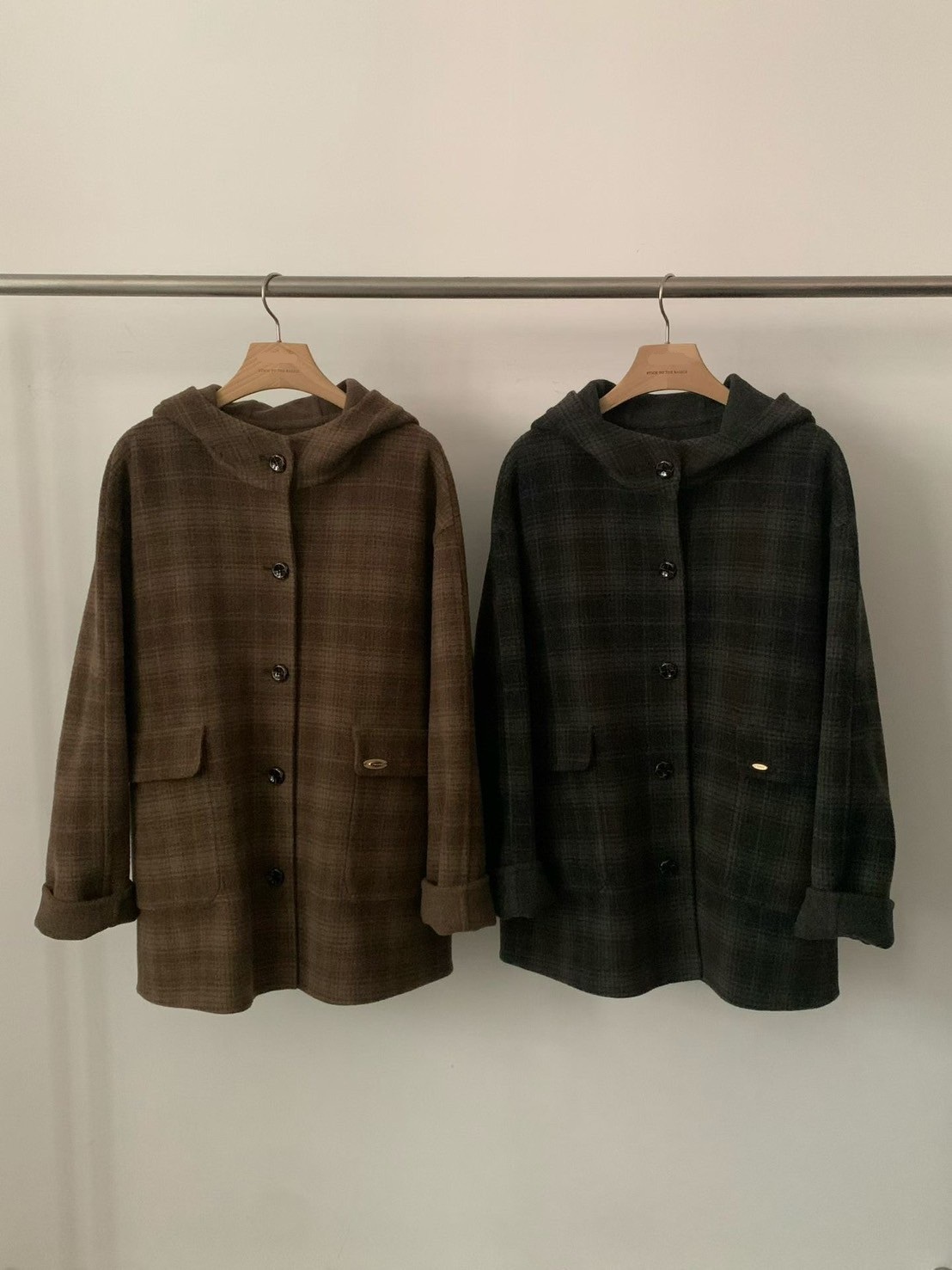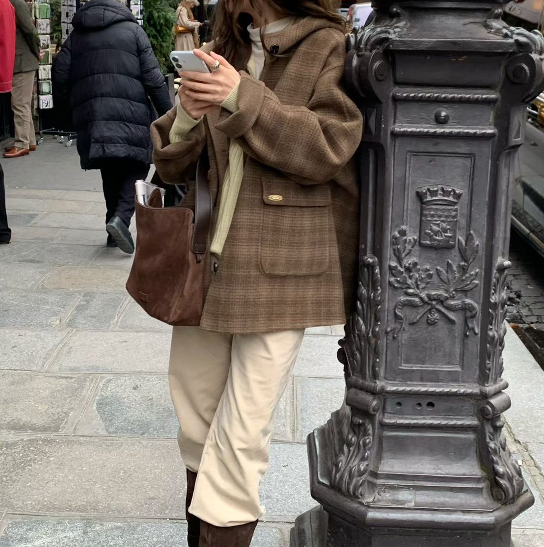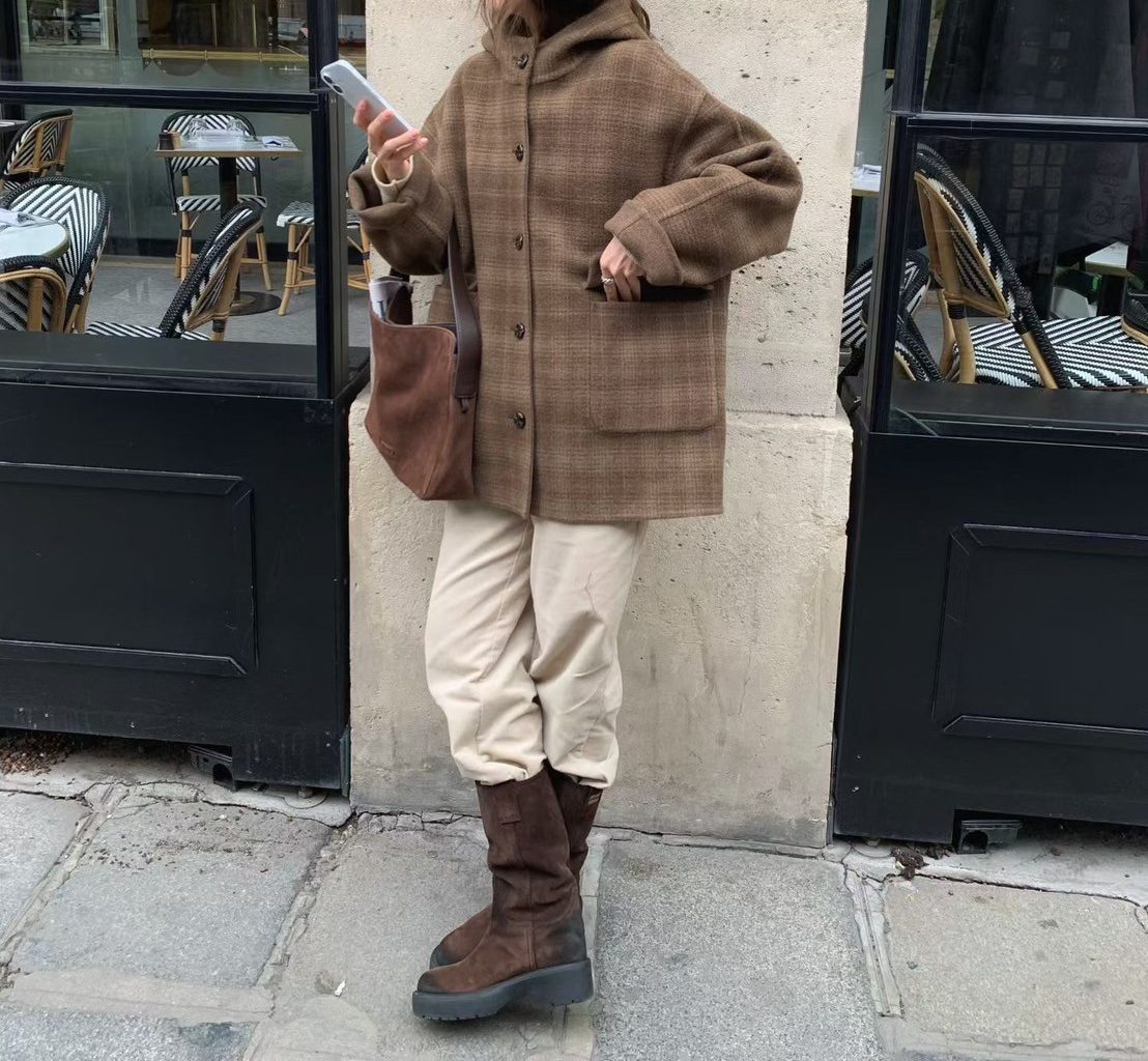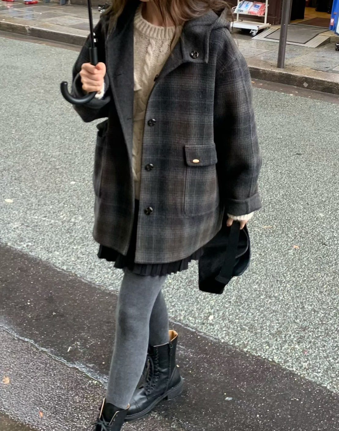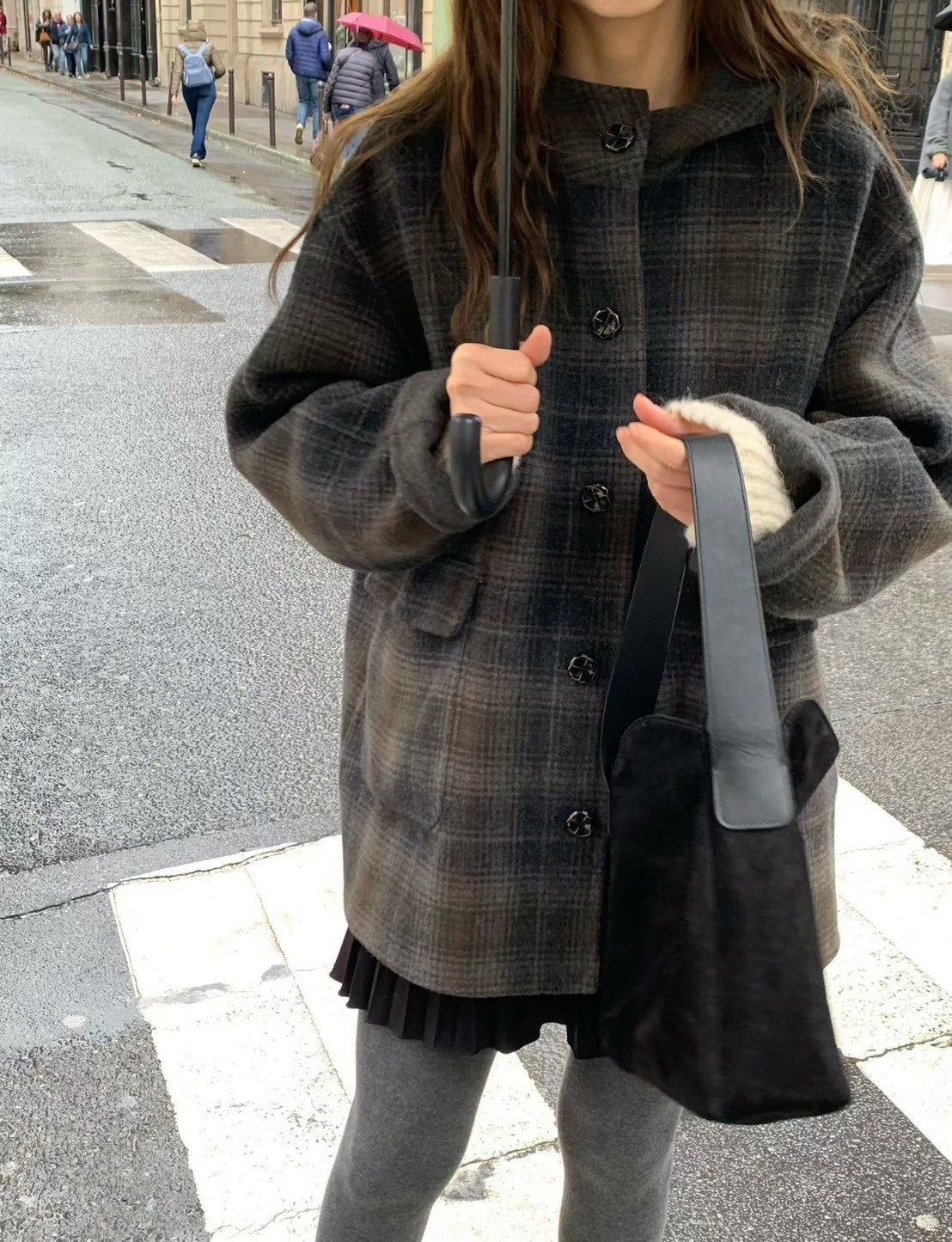 高級法式格紋兩面穿羊毛連帽手工大衣