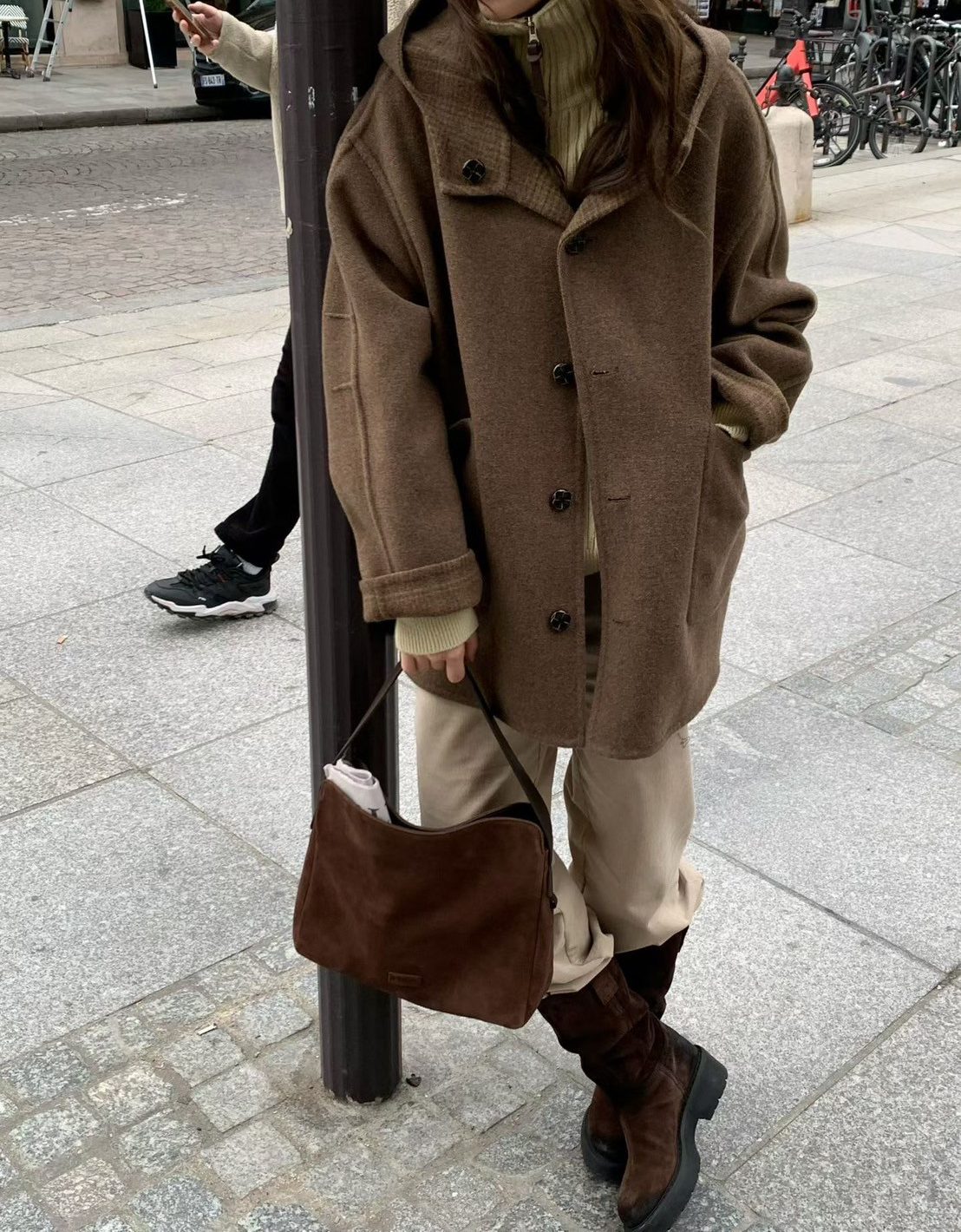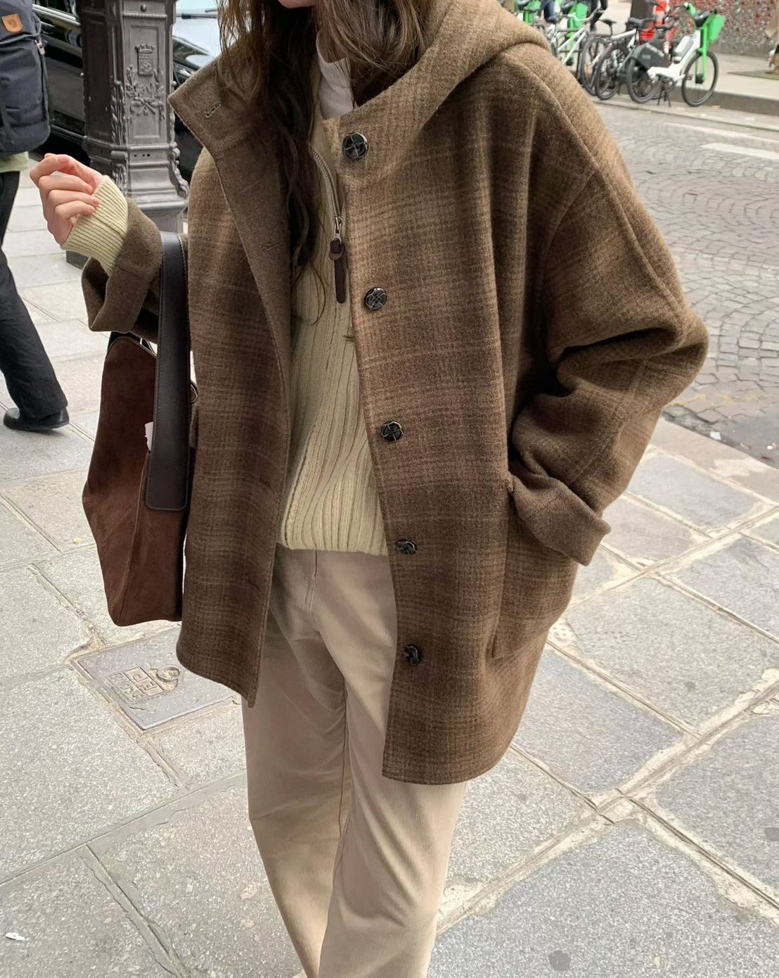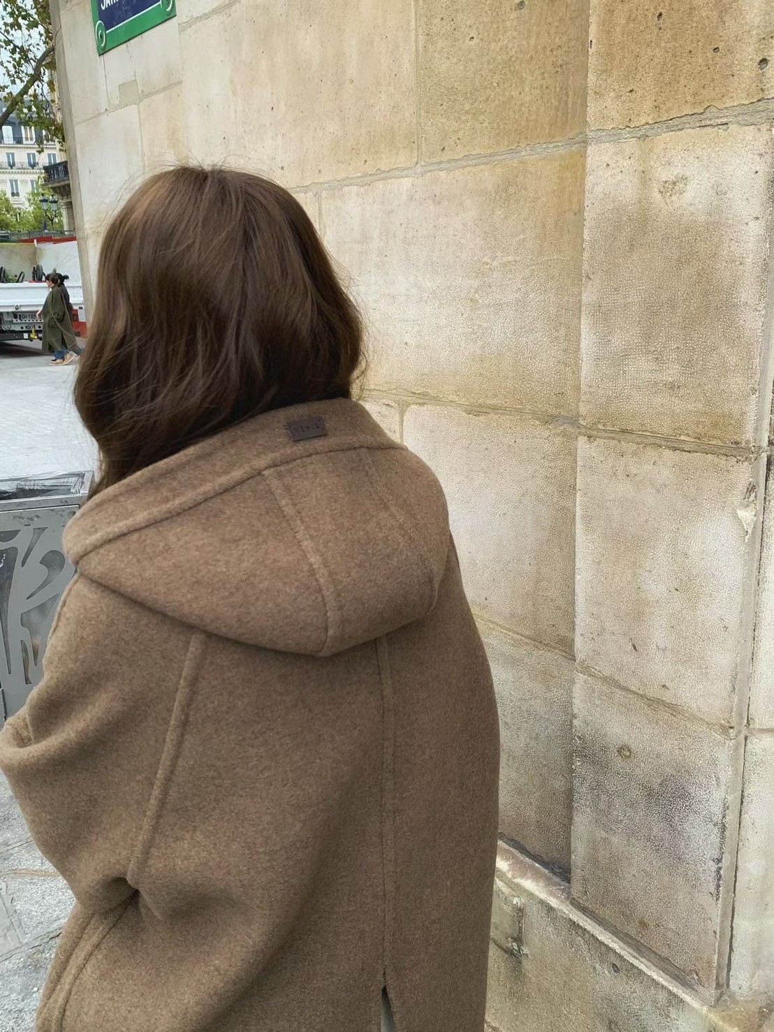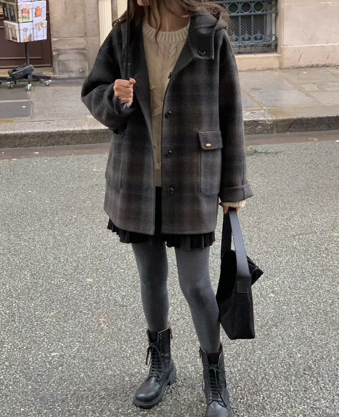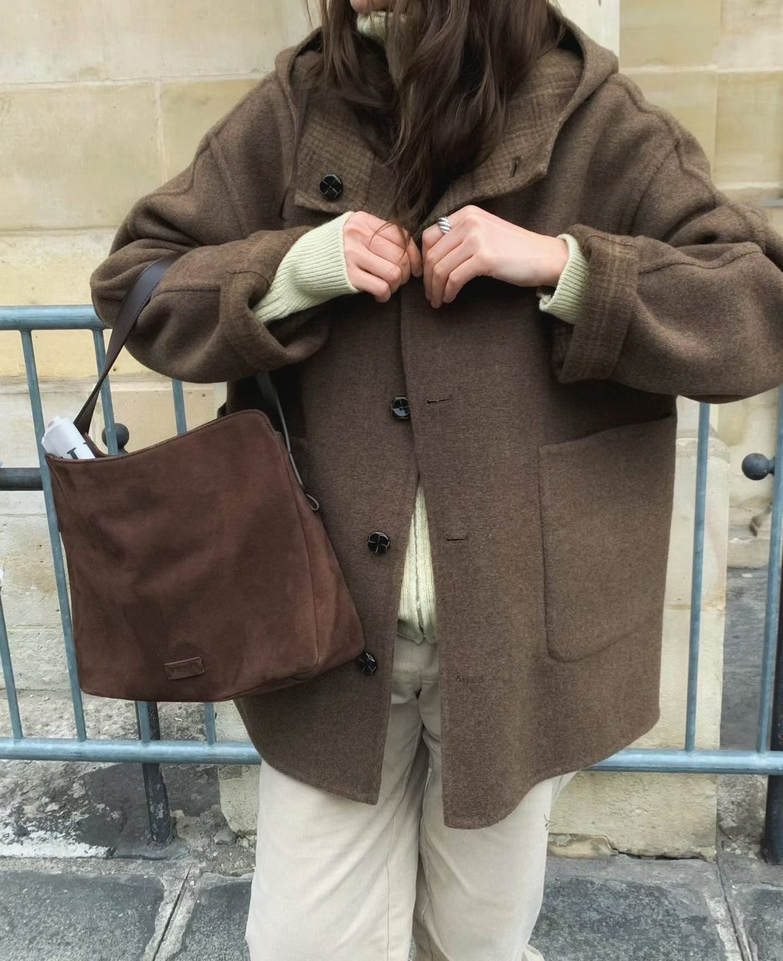 高級法式格紋兩面穿羊毛連帽手工大衣